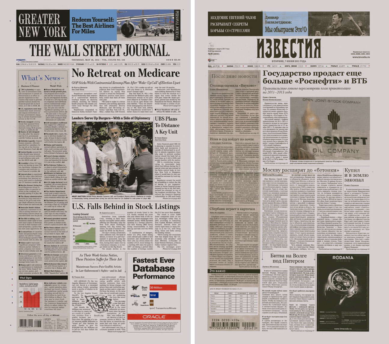 Обратите внимание на заголовки в "The Wall Street Journal". Они куда читабельнее "Известинских", и сразу расставляют приоритеты внимания. Да и с вёрсткой у "Известий" явно хуже...