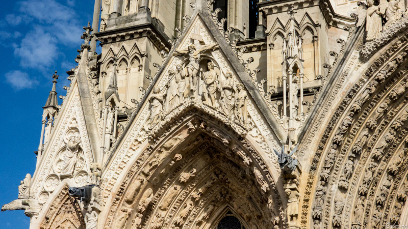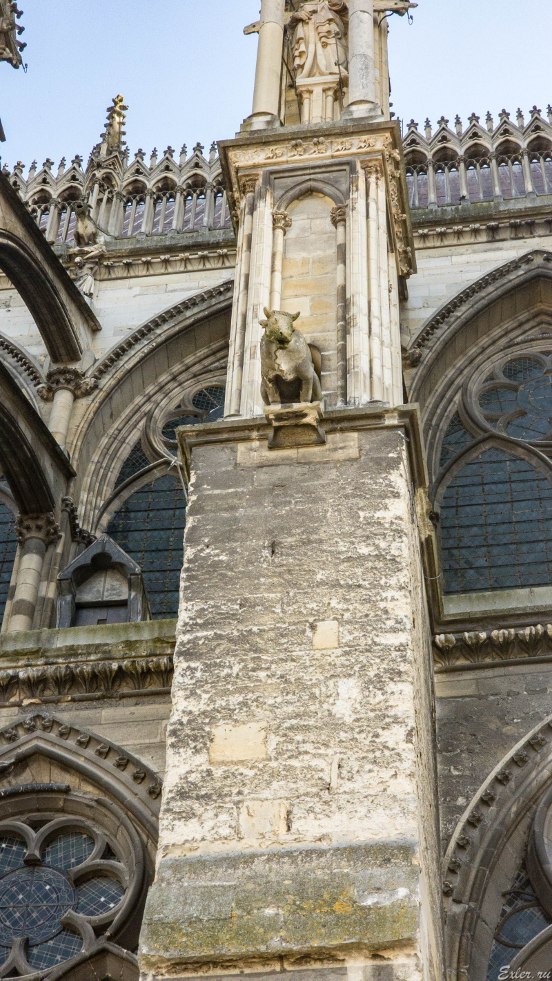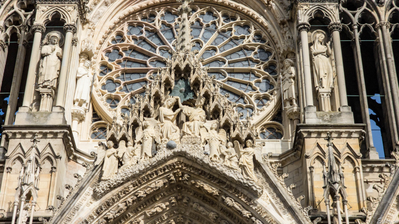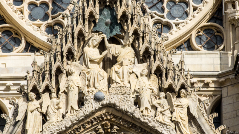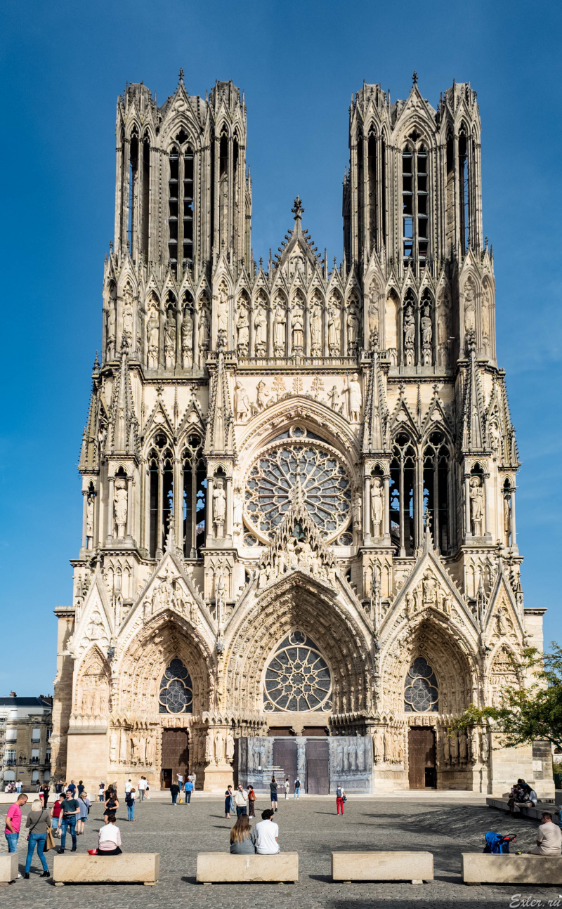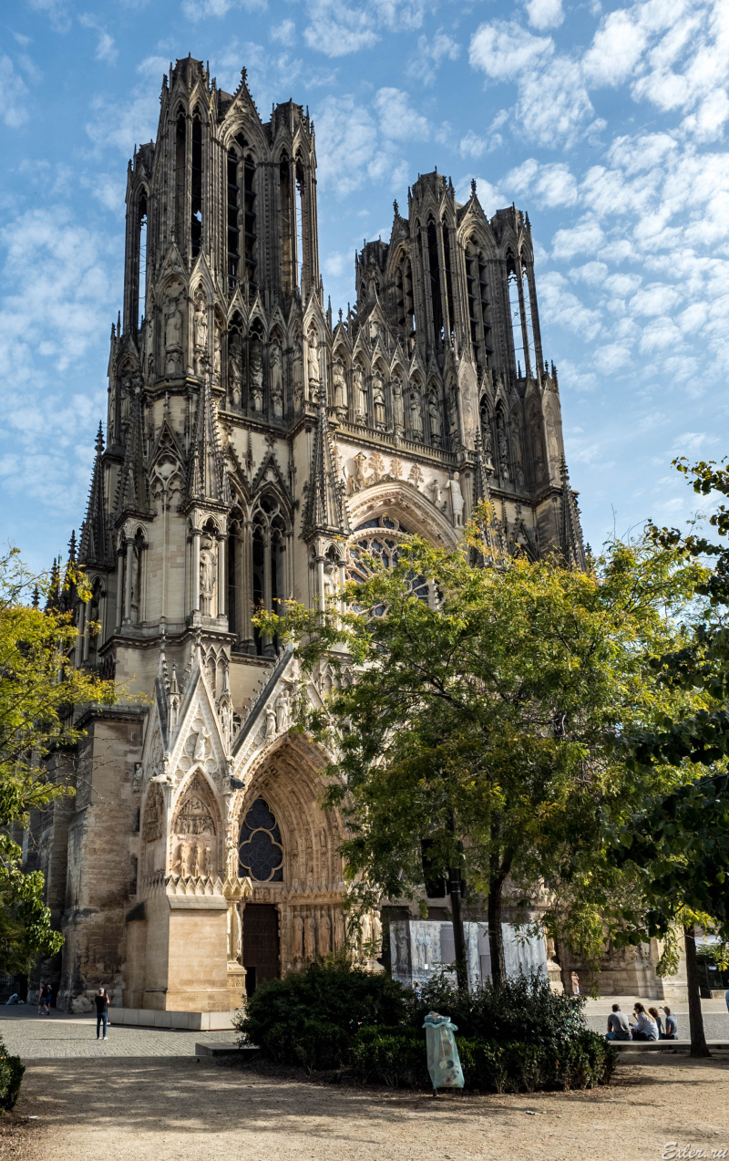Кафедральный собор города Реймса (Notre-Dame de Reims) - совершенно уникальное сооружение, один из самых известных памятников готической архитектуры Франции. Он был построен в XIII веке (позже Собора Парижской Богоматери) на месте собора V века, в котором крестился франкский король Хлодвиг I, а потом в 816 году крестился сын Карла Великого Людовик Благочестивый.