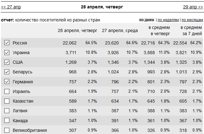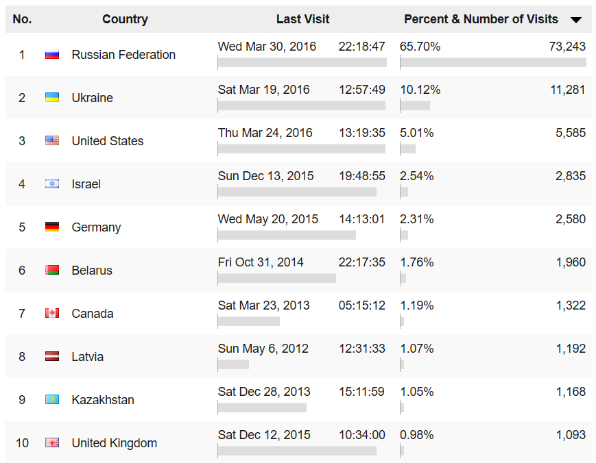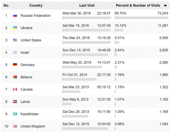 Статистика более чем странная, неужели последний визит из Беларусии был полтора года назад, а из Латвии аж 4 года назад? А стран, откуда захожу я, вообще в списке нет:).