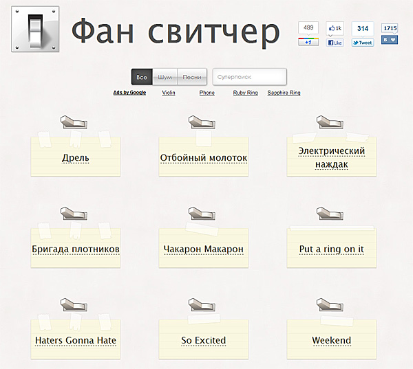 Какие-то очень хорошие люди сделали гениальный сервис - Фан свитчер! Если вас достали соседи с ремонтом, металлом или песнями Стаса Михайлова (он же Сердючко, он же Сенчукова) - проводочек с компа на мощные колонки, выбираете источник звука и врубаете. Все. Враг повержен. Если не сработает звук перфоратора, тогда врубайте тяжелую артилерию - Стаса Михайлова (он же Сердючко, он же Сенчукова), но это уже садизм!