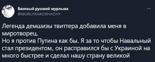 Если спросить у "глубинного народа", откуда ответят: "А что вам нужно? Поддерживаем. Воевать с Украиной - поддерживаем. Уйти с Украины - поддерживаем. Стать колонией США - поддерживаем. Ядерная война - поддерживаем. И [B]отстаньте от нас[/B"].