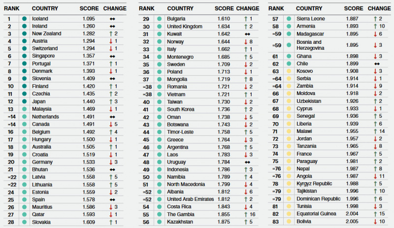 Первая пятерка самых безопасных стран - Исландия, Ирландия, Новая Зеландия, Австрия и Швейцария.