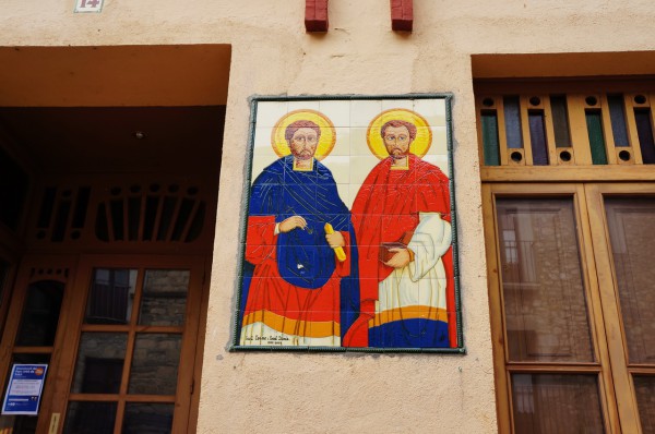 На здании мэрии - два местных святых, покровителей города.