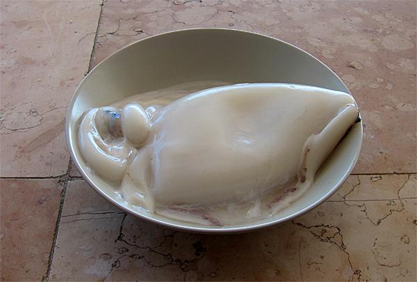 Мои испанские знакомые каракатицу жарят целиком, а я предпочитаю ее разрезать на небольшие кусочки. В ход идет почти все, кроме круглого твердого образования, которое расположено вверху над щупальцами. Его надо вырезать и выкинуть. Остальное просто режется на части.