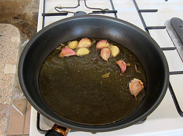 На сковородку - от души оливкового масла, разогреть, покидать туда раздавленные плоской стороной ножа зубчики чеснока (можно не чистить).