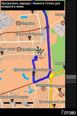 Есть, конечно, несколько неудобств. Например, в режиме просмотра карты маршрута нельзя ткнуть по карте и сказать "ехай сюда", хотя в обычном режиме просмотра карты то же самое возможно. В режиме ведения по маршруту нельзя двигать карту (вываливает в меню при касании). Масштабирование при этом осуществляется двумя малюсенькими кнопочками, по которым легко промазать и вывалиться в то же самое меню.