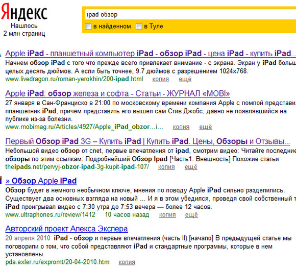 На Google мой обзор iPad поднялся до третьего места. Однако на "Яндексе" на пятом месте почему-то присутствует ссылка на pda-версию обзора, на которую заходит на несколько порядков меньше народу, чем на основной сайт. Ссылки на нормальную версию там нет вообще - по крайней мере, на нескольких первых страницах. Ни фига себе релевантность...