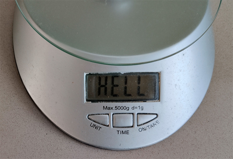 Вот так меня нынче приветствуют кухонные весы. Человек нервный и суеверный, наверное, вздрогнул и побежал бы молиться и класть поклоны, но я знаю, что у весов у последнего символа половина не пропечатывается, так что просто пошел класть котлеты в тарелку.