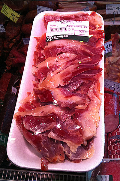 Виноват, признаю. Почитал технологию изготовления сего деликатеса. Полный технологический цикл занимает 10-12 месяцев. На фото же видим практически свежее мясо, возможно экспресс-засолки с ароматизаторами.