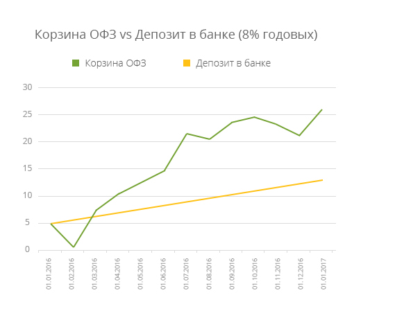 Доходность от вложений в ОФЗ тем выше, чем ниже ставка ЦБ. А вот по банковским депозитам ситуация обратная — чем ниже ставка ЦБ, тем ниже ставка по вкладам. Инвесторы, которые вложились в двадцатилетние ОФЗ в начале 2016 года, в конце года из-за снижения ставки на 1% получили необлагаемый налогом доход порядка 15–16%. А банки, напротив, к концу года снизили ставки по вкладам до 7-8%.