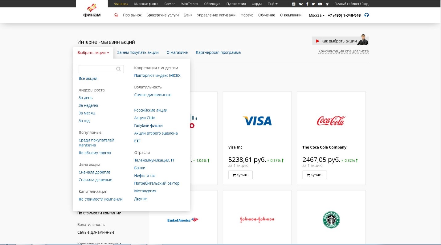 Выбор акций не представляет сложностей даже для неспециалиста — с помощью фильтров можно отобрать самые популярные или самые динамичные бумаги, ранжировать их по цене, по доходности, по отраслям или по капитализации. Впрочем, посетитель всегда может обратиться к услугам консультанта, который подскажет, что именно купить тем, кто вам дорог.