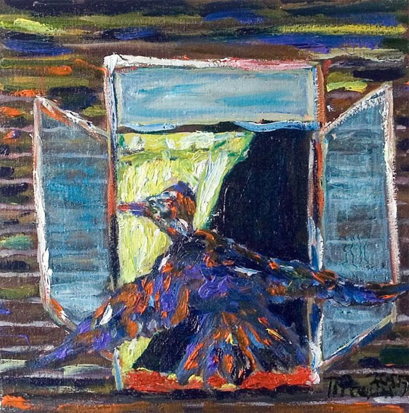 Впрочем, я все-таки выяснил, что вызывает к жизни эти шедевры творца. Он сам на это ответил картиной под названием "Я ударюсь об стену, пытаясь влететь в окно":