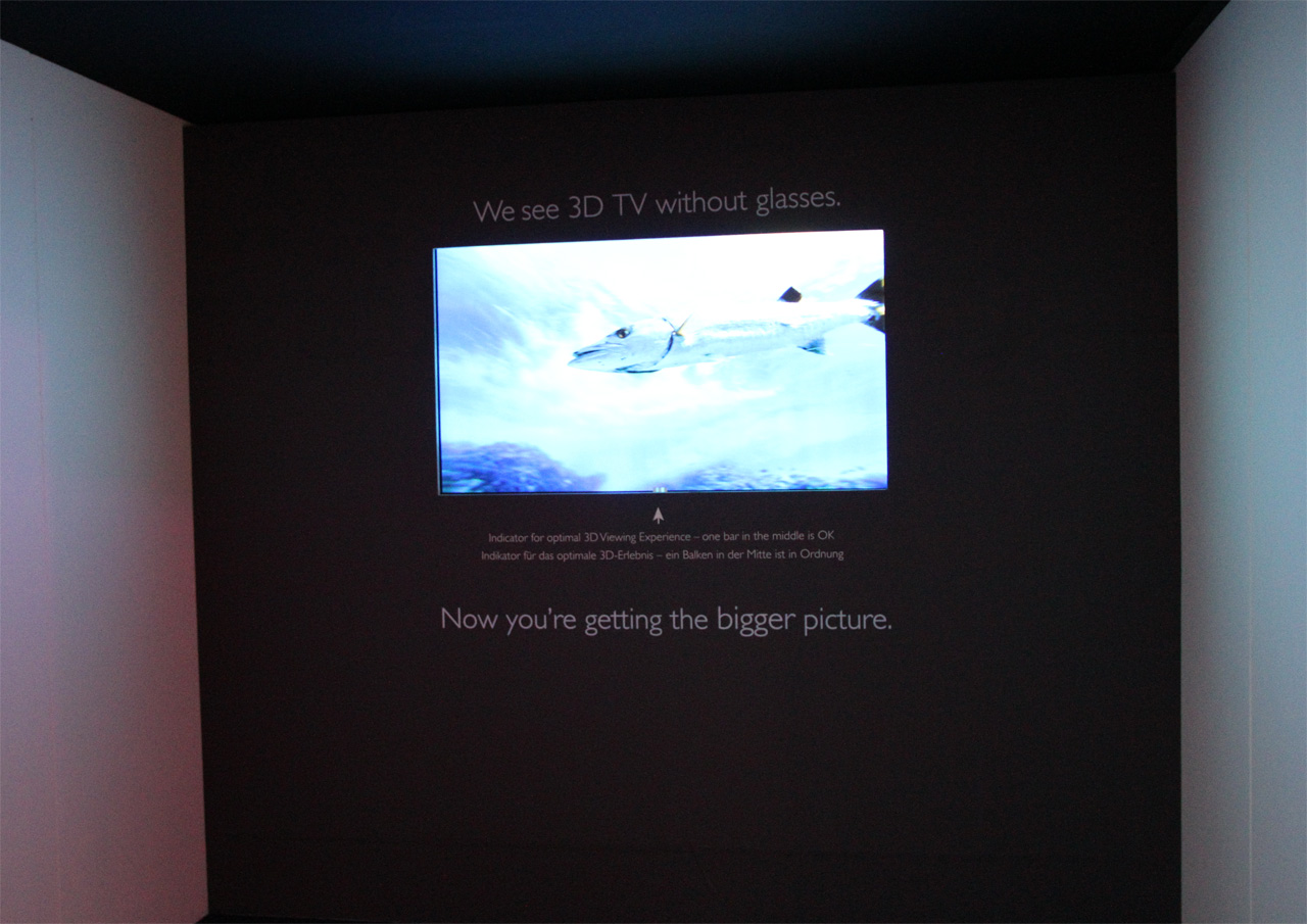 На стенде Philips (но и не только там, конечно) демонстрировался трехмерный телевизор, не требующий для просмотра очков. Однако там было три заметных минуса. Во-первых, такой телевизор пока стоит как самолет. Во-вторых, он требует заметного затемнения в помещении. В-третьих, явный трехмерный эффект вы заметите только в том случае, если голова будет расположено строго по центральной вертикальной оси телевизора. То есть одновременно с женой трехмерную картинку увидеть не удастся, придется пихаться локтями.