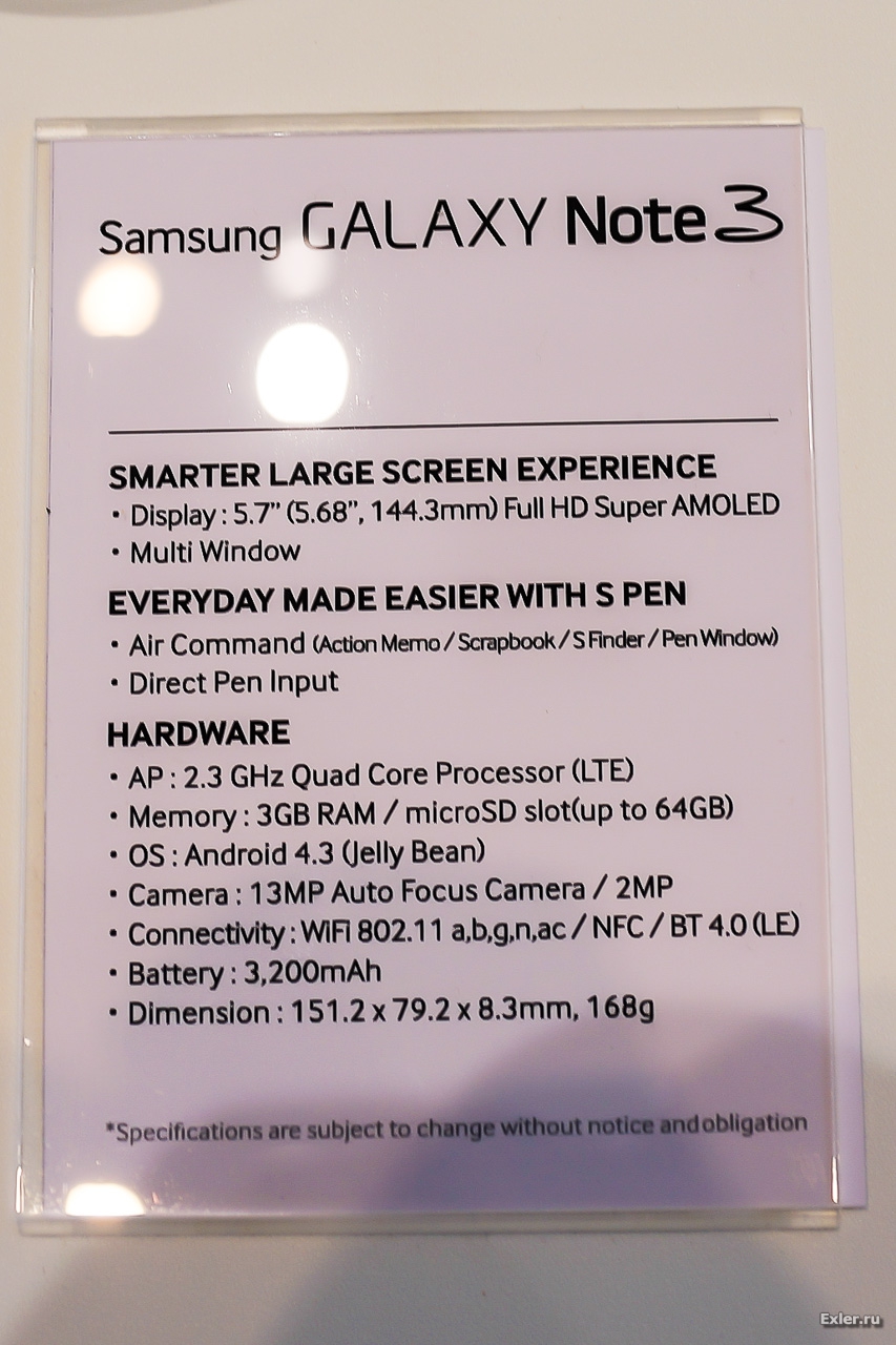Дисплей 5,7" (у предыдущего 5,55"), 3 Гб памяти (у предыдущего 2), камера 13 Мп (8 Мп), батарея 3200 (3100), процессор 2,3 GHz 4 ядра LTE (Exynos 4412 4 ядра 1,6 GHz). Смартфон стал тоньше и легче.