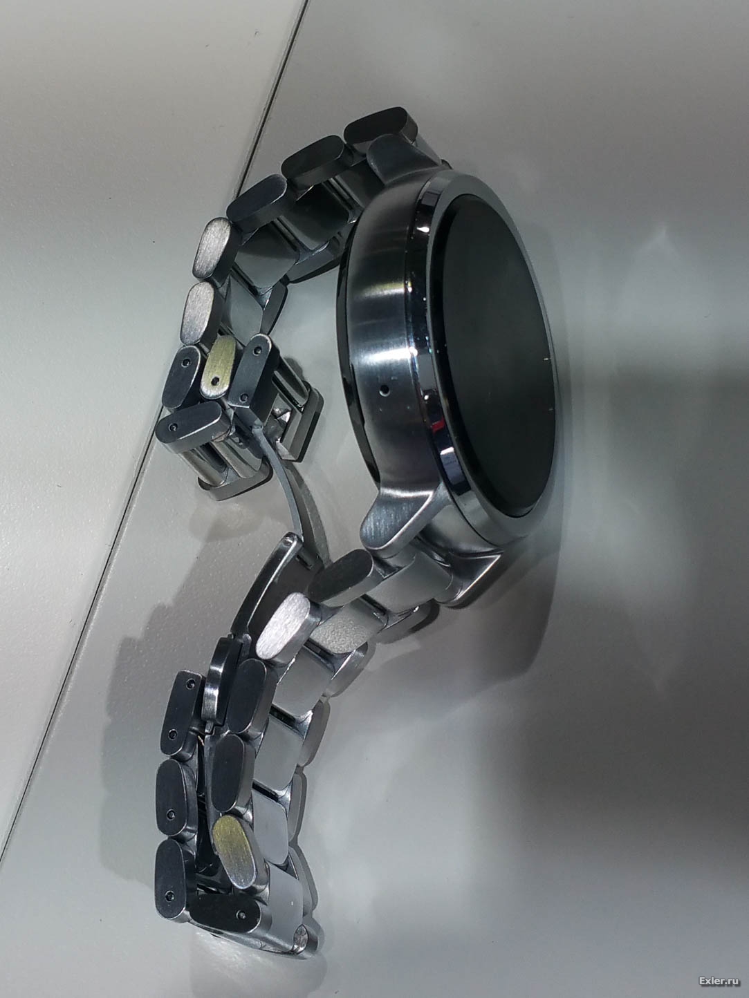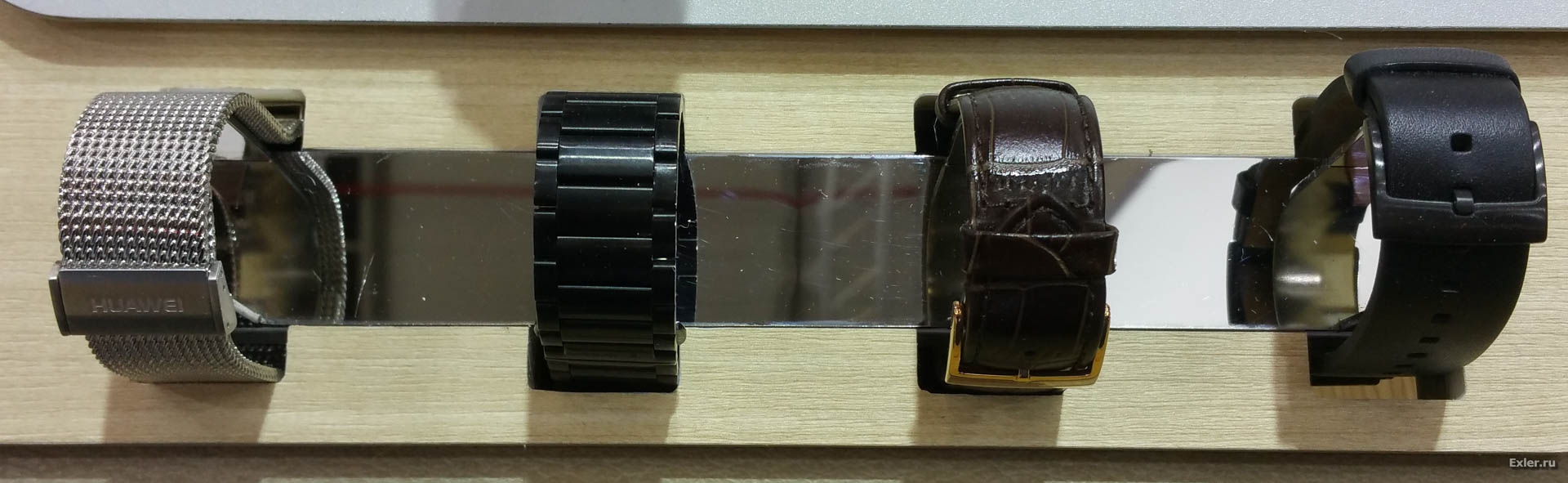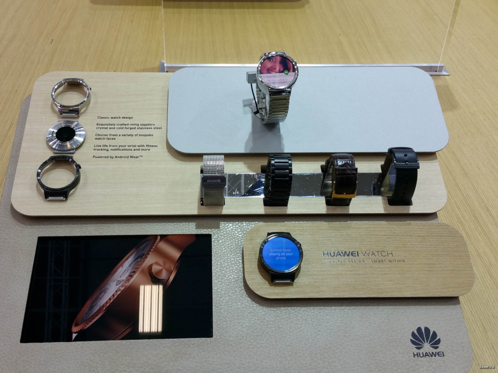 Давно ожидаемые "умные" часы от Huawei. В прошлом году их презентовали, но на стенде давали пощупать только в секретной комнате (я о них писал). Я их очень жду, они выглядят лучше всех часов, что я видел - не гаджет для гиков, а уже вполне приличные часы. Если там еще Android Wear не испохабили, как это сделано в Moto 360, то может получиться очень интересно. У них два варианта корпуса (стальной и черный) и четыре вида ремешков: два стальных, два кожаных.