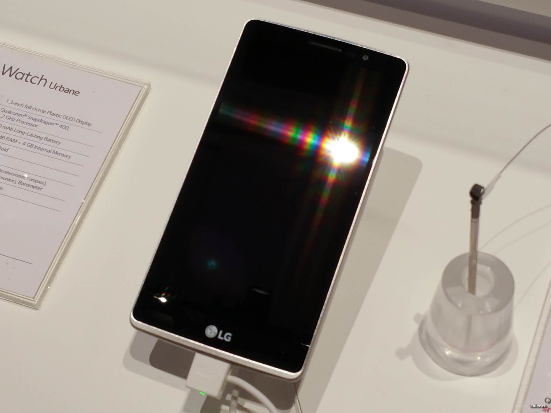 Стенд LG. Показывали LG G4 и "Умные" часы LG Watch Urbane. Также показали модификацию LG G4s, у которой дисплей 5,2" Full HD, 1,5 Гб оперативки, 8 (!) Гб памяти, камера 8 Мпикс и батарея 2300. То есть ни о чем - какой-то сильно везде урезанный G4. Но зато продается почти в два раза дешевле. Хотя и это дешевле - 20 тысяч рублей. За 20 тысяч рублей смартфон с такими характеристиками? Я это не понимаю. Но в LG реализуют вполне себе сработавшую идею о том, что вместе с флагманом надо выпускать что-то очень на него издали похожее, но сильно урезанное. Потому что аналогичный LG G3s, насколько я понял, продавался хорошо. Вот они и продолжили старую традицию. Значит, действительно находятся люди, которые тратят на смартфон деньги по принципу "а пускай подумают, что у меня LG G4". Бывает, люди иногда вообще совершают очень странные поступки.