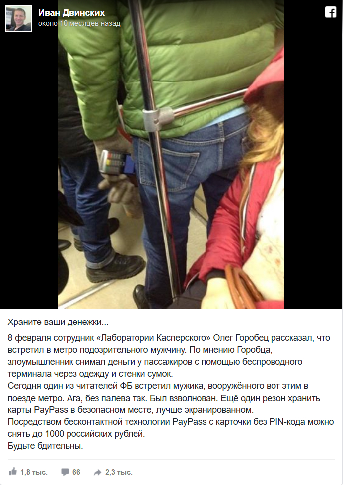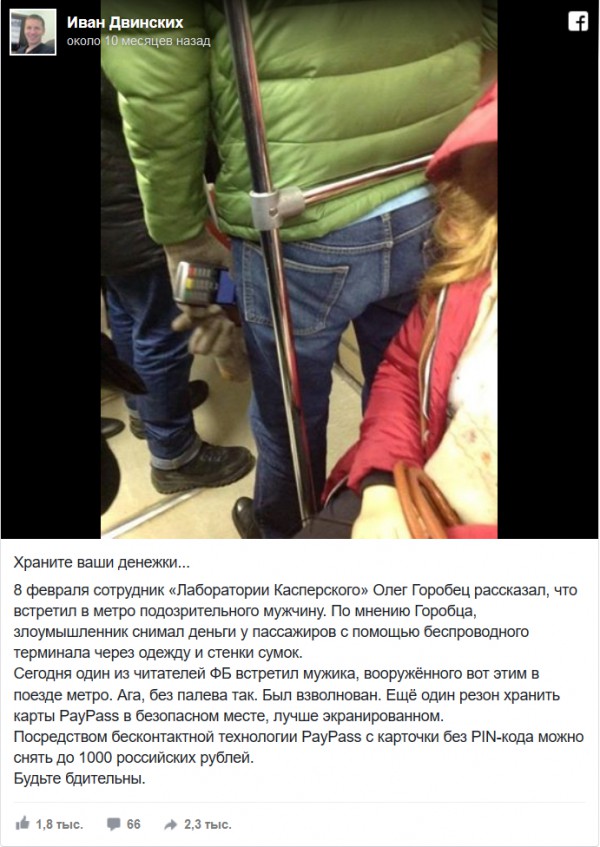 Помните забавную историю о том, как сотрудник "Лаборатории Касперского" сфотографировал в метро курьера с POS-терминалом для оплаты покупок картой (ко многим наверняка на квартиру такие курьеры нередко приезжают) и высказал предположение, что это мошенник, который похищает данные с карт пассажиров с помощью бесконтактных платежей?