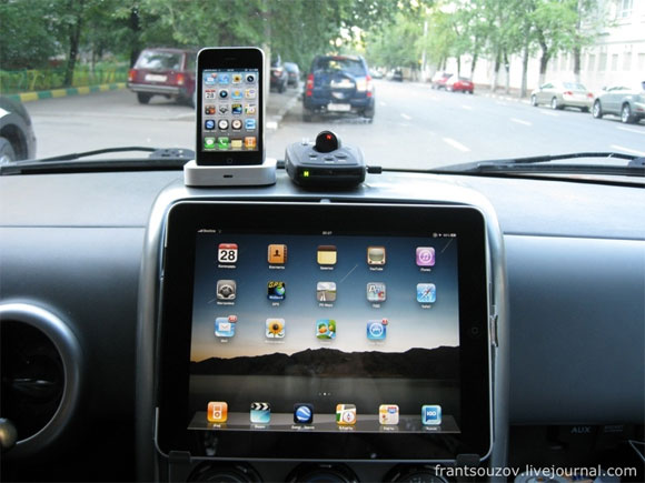 Если у человека руки растут из правильного места, то он может приспособить к машине даже продукцию фирмы Apple. Правда, глубокий смысл этого я так и не понял - на мой взгляд, проще было приспособить нормальный виндовый ноутбук (автор писал, что он уже ставил какой-то нетбук, и тот у него глючил, но что мешало взять менее глючный ноутбук, собственно?), тем более что навигация (основное, что нужно в автомобиле) для iPhone/iPad по прежнему ужасная. Но зато у продукции Apple такие классные белые пультики, так что понятно, что не все устоят.