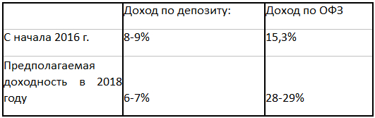 Для сравнения — средняя ставка по вкладам в российских банках сейчас составляет 8-9%. Надеяться на то, что ставки по вкладам вырастут, не стоит — ЦБ России проводит политику удержания низкой инфляции. Ставки по вкладам в дальнейшем будут, вероятнее всего, только снижаться вслед за снижением ключевой ставки ЦБ. А вот цена облигаций федерального займа со снижением ставки ЦБ будет только расти. Поэтому купив сейчас облигацию, которая торгуется ниже номинала, инвестор через несколько лет получит доход не только по купону облигации, но и за счет роста ее стоимости.