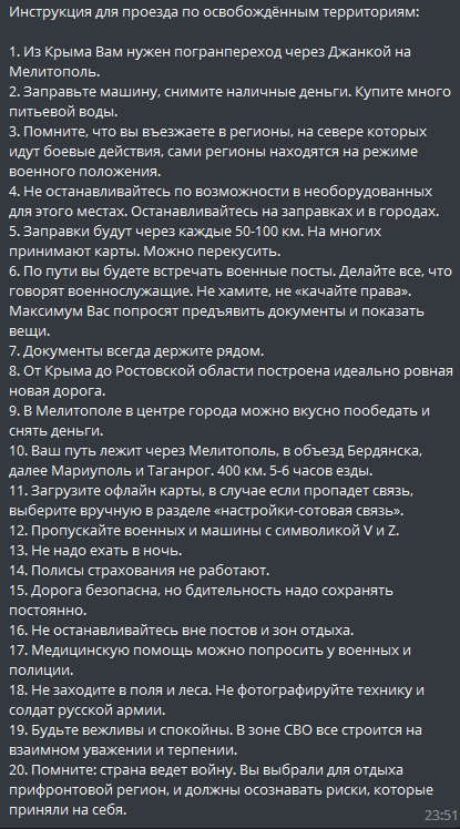 По Сети распространяется: пишут, что эту инструкцию выдают водителям, которых из Крыма отправляют через оккупированные территории. (Что отправляют - это чистая правда.) Если инструкция подлинная, то фразы "в зоне СВО все строится на взаимном уважении и терпении", а также "Помните: страна ведет войну" - вставляют безмерно.