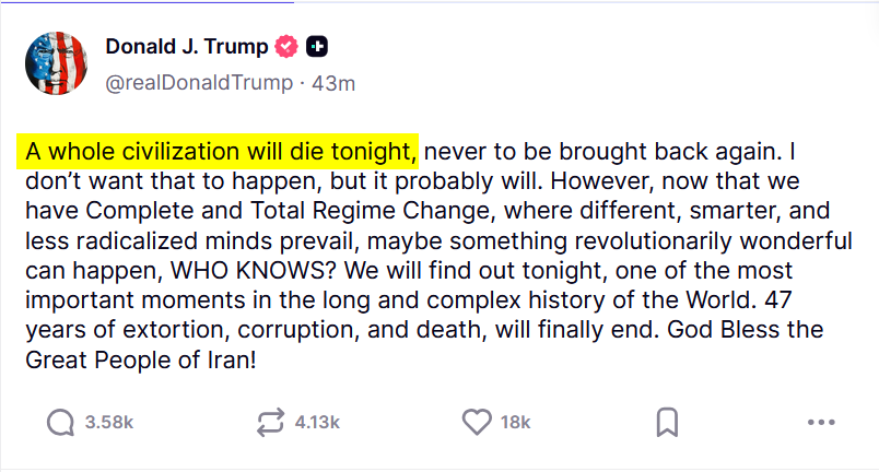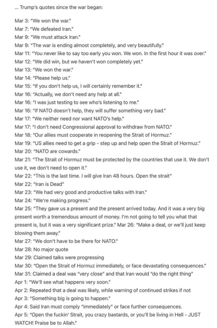 Apr 5: "Open the fuckin' Strait, you crazy bastards, or you'll be living in Hell - JUST WATCH! Praise be to Allah."