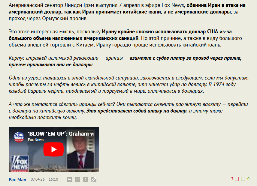 Дональд Трамп: Я бы лучше сделал так, чем позволил это им, верно? Почему бы и нет? Мы победители. Мы победили, понятно? Они разгромлены в военном отношении. Единственное, что у них осталось — это психология в духе: «О, мы сейчас сбросим пару мин в воду», ясно? Нет, мы... я имею в виду, у нас есть концепция, согласно которой пошлины будем взимать мы, понятно?