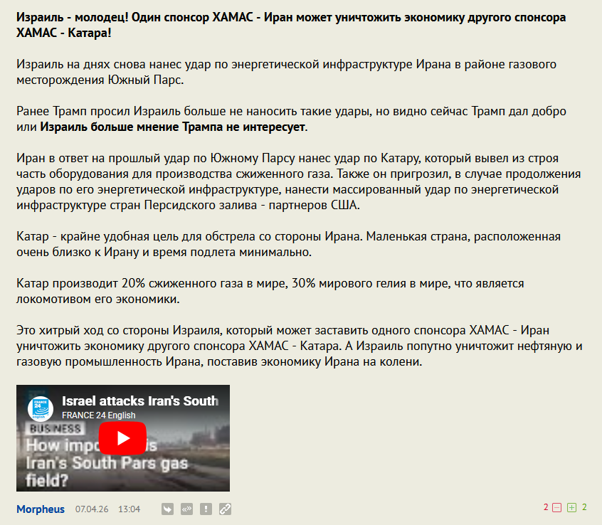 Это хитрый ход со стороны Израиля, который может заставить одного спонсора ХАМАС - Иран уничтожить экономику другого спонсора ХАМАС - Катара. А Израиль попутно уничтожит нефтяную и газовую промышленность Ирана, поставив экономику Ирана на колени.
