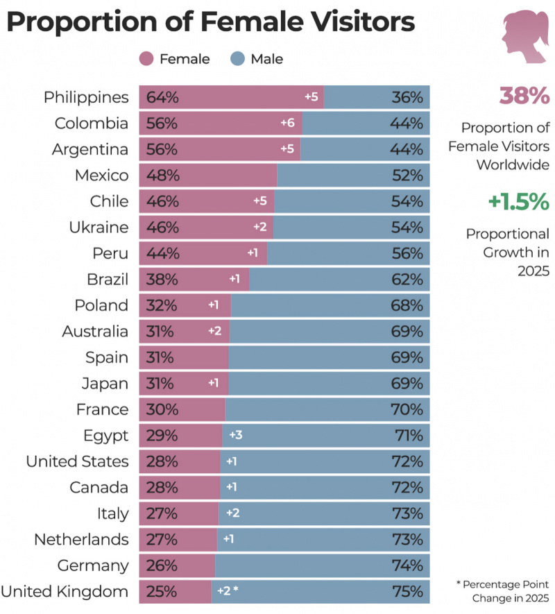 А меня заинтересовала другая статистика - процентное соотношение мужской и женской аудиторий по странам. Это к утверждению "Женщины pron не смотрят". Мужчины, конечно, обычно преобладают, но в трех странах - Филиппины, Колумбия и Аргентина - женская аудитория преобладает над мужской. В остальных странах, если усреднять, то получается где-то 70% мужчин на 30% женщин.