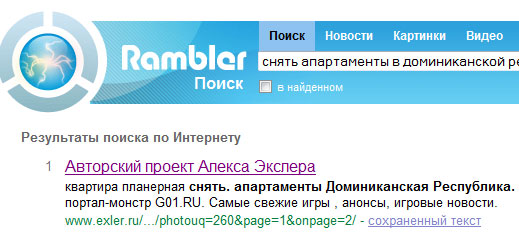 Потом понял. Снизу стоит реклама Яндекс.Директ. Видимо там проскакивали апартаменты и Доминикана - это вполне возможно. Но с чего вдруг мой сайт по этому запросу вылез на первое место через рекламу Яндекс.Директа - это надо спросить "Рамблер". В Google и Yandex ничего подобного не появляется.