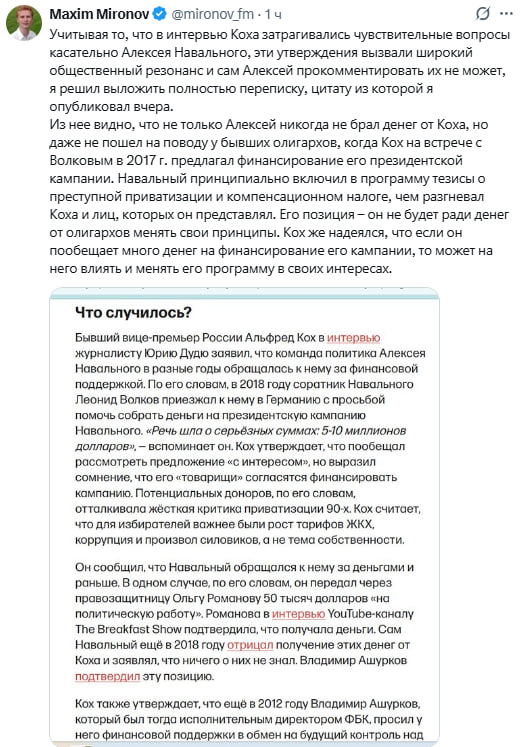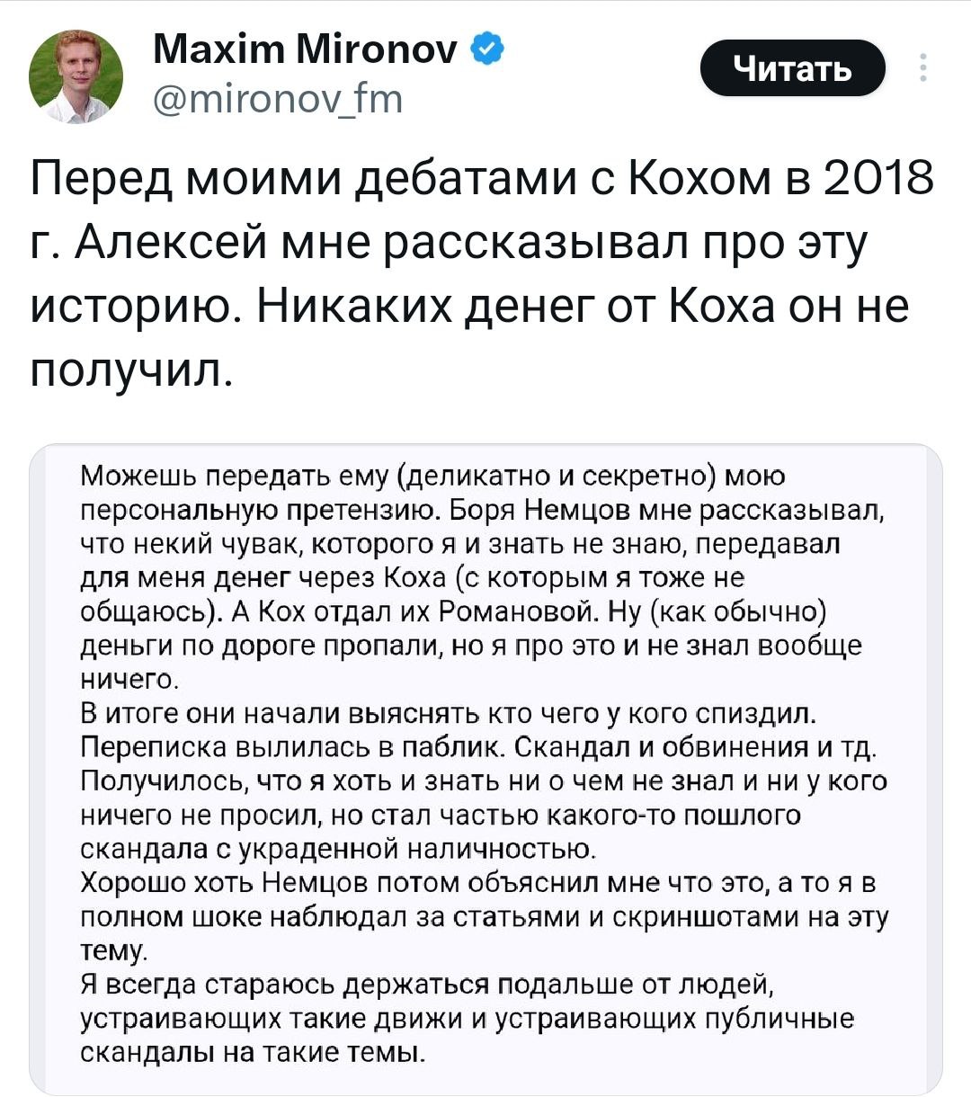 ВКРАТЦЕ: Кто-то попросил Коха передать донат Навальному (видимо, посчитал, что они хорошо знакомы, хотя это не так), но по пути деньги "потерялись" и до Навального не дошли.