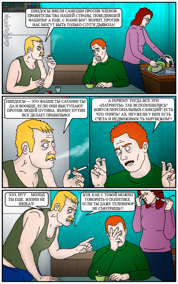 Он, похоже, реально верит в том, что говорит. А ведь это не простоя работяга с завода. Книжки умные читал и всё такое. Прямо скажем не средний обыватель. А как же тогда у средних то обывателей в мозгах насрано?