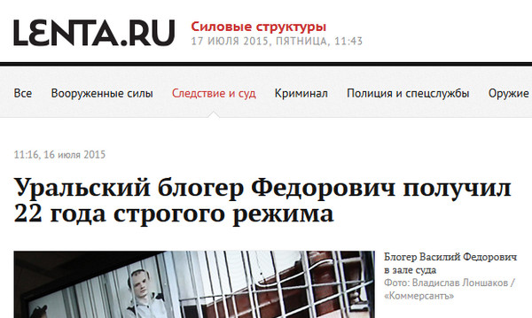 И при этом они ставят заголовок: "Уральский блогер Федорович получил 22 года строгого режима".