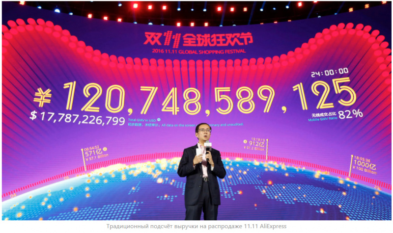 Интересно, что в 2012 году распродажа на Tmall обошла по объёму продаж американский «Киберпонедельник», в 2016-м году подвинулась уже «Чёрная пятница», а в 2017-м на распродаже 11.11 от AliExpress было продано товаров на общую сумму более $25 миллиардов. Для сравнения, западные «Киберпонедельник» и «Чёрная пятница» в тот же год вместе сгенерировали только $11 миллиардов.