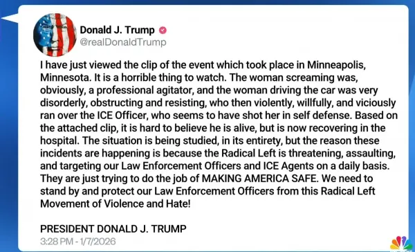 Трамп по поводу этого инцидента уже заявил, что он видел ролик, что та самая злобная женщина в машине была профессиональной агитаторкой, и что она нарочно наехала машиной на сотрудника ICE, который выстрелил в целях самообороны, страшно пострадал, но теперь чудом восстановился.