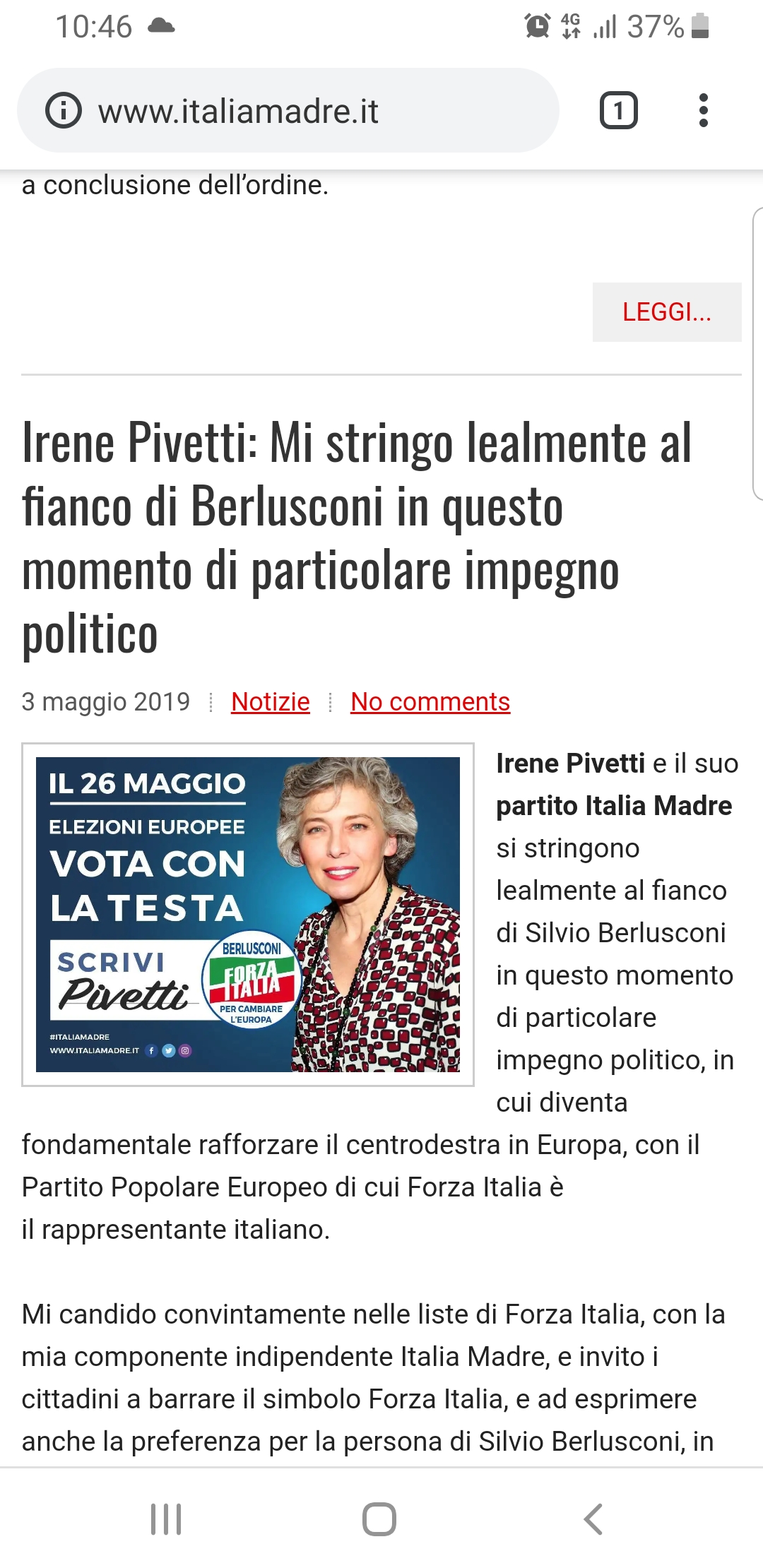 Для начала попытался найти, что это вообще за партия такая - "Italia Madre". В списке основных политических партий Италии никаких следов не находится. В списке малых партий - не находится. В списке региональных партий (мельче уже не бывает) - не находится. Но вообще существует, вот их сайт. Такое впечатление, что вся партия состоит из этой тетки. Сайт похож на захиревший бложик, последний раз обновлялся в апреле 2018 года - серьезная партия, куда деваться.
