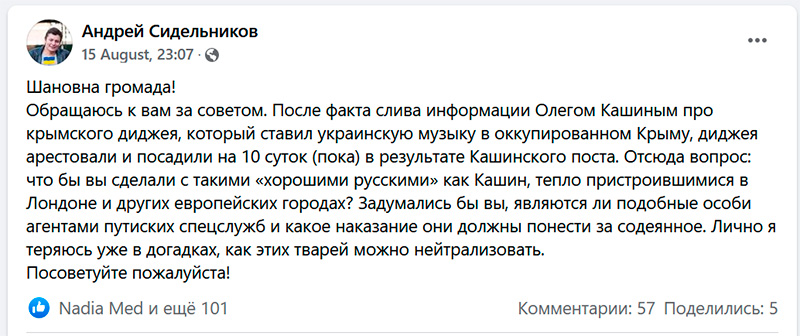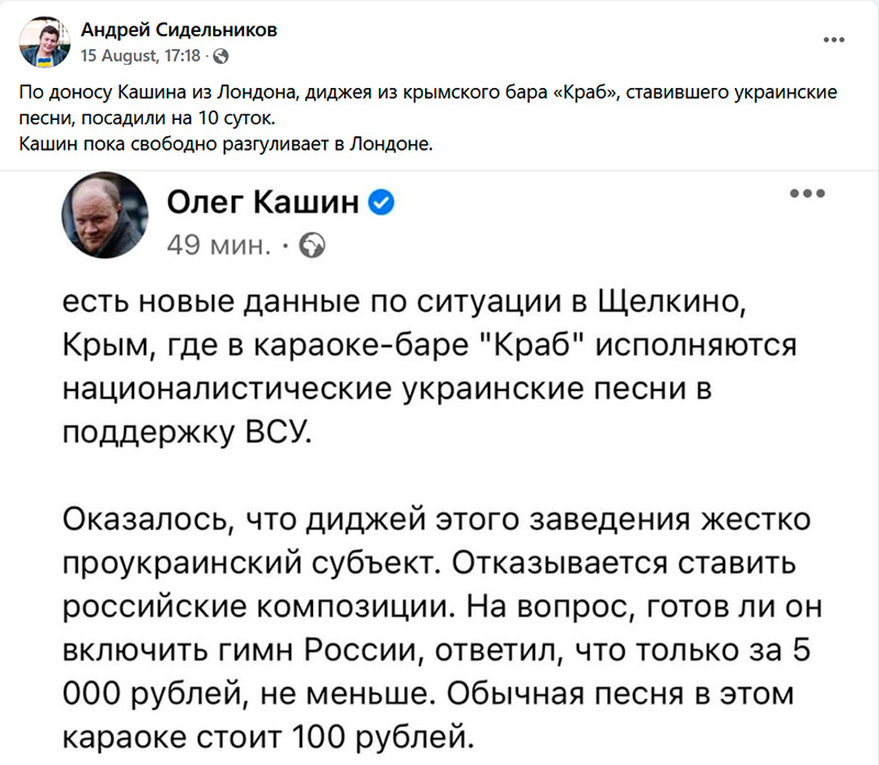 Так вот, этот Сидельников,  увидев пост выдающегося феномена Кашина, в своем FB поднял крик на тему, что, мол, диджея по доносу Кашина посадили на 10 суток, а Кашин, мол, при этом свободно разгуливает по Лондону, и что как же это так, господа?!!