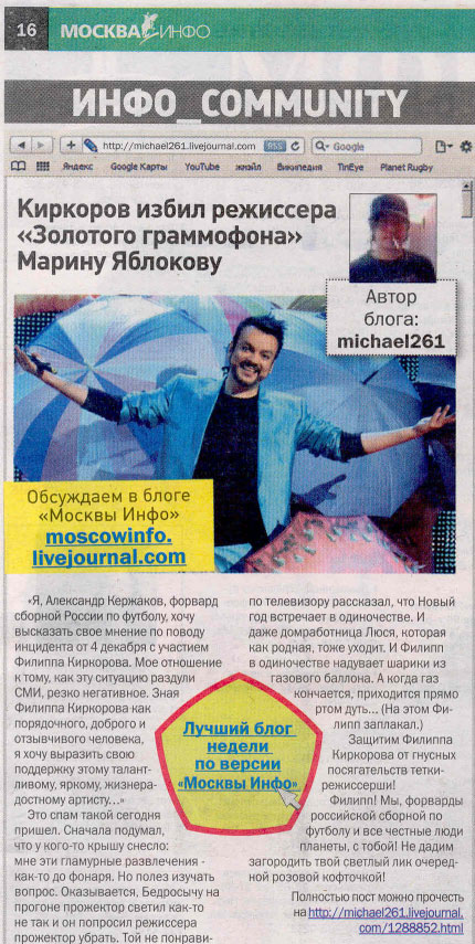 И как вы думаете, чей блог оказался лучшим недели - по версии "Москвы Инфо"? Правильно, блог michael261. У него ровно один "френд" - michael261. Но зато парень сделал классную запись по поводу Киркорова - "Москва Инфо" ее цитирует целиком.