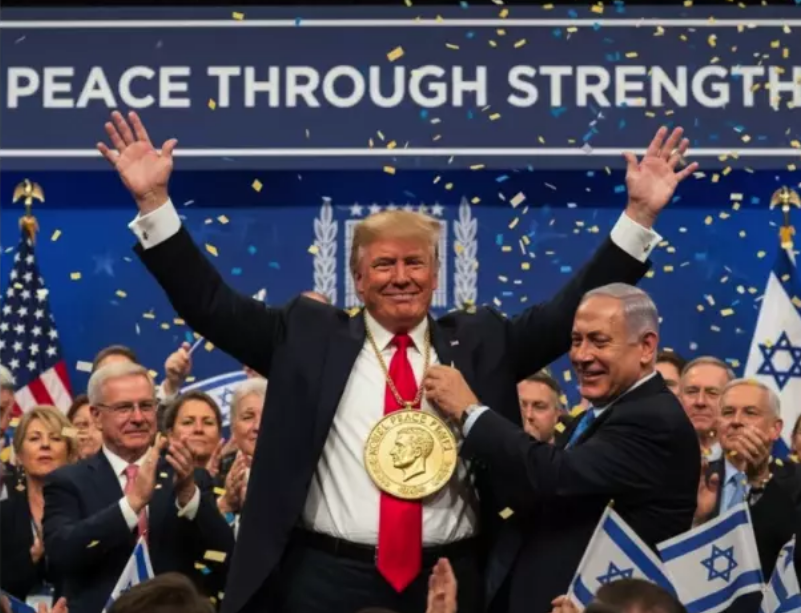 Нетаньяху сопроводил свой пост изображением, созданным с помощью искусственного интеллекта. На нем американский лидер показан с медалью на шее на фоне аплодирующей толпы.