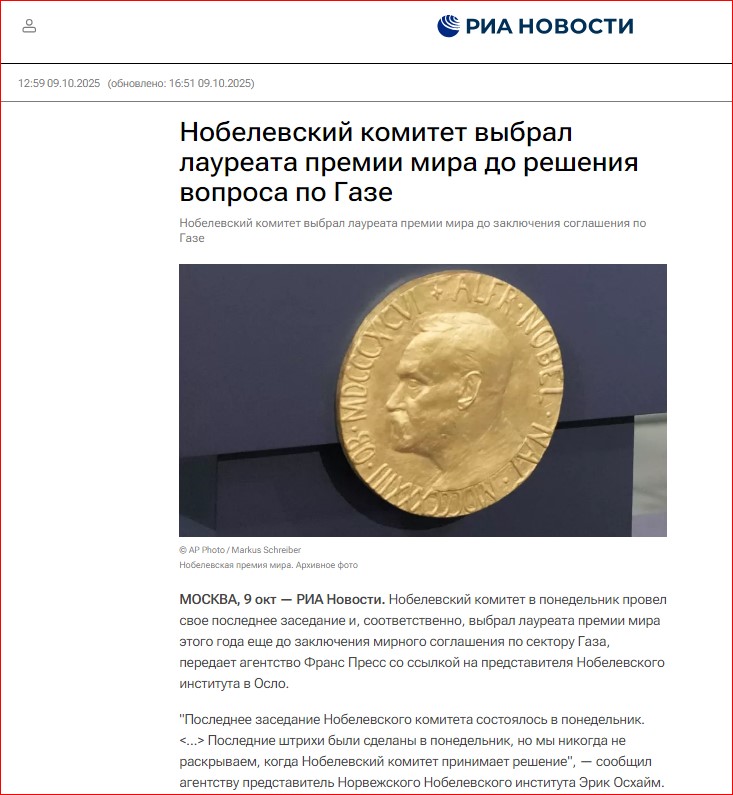 "Офис премьер-министра Израиля Биньямина Нетаньяху считает, что президент США Дональд Трамп заслуживает Нобелевской премии мира. Соответствующее заявление 9 октября появилось на странице канцелярии в соцсети Х."