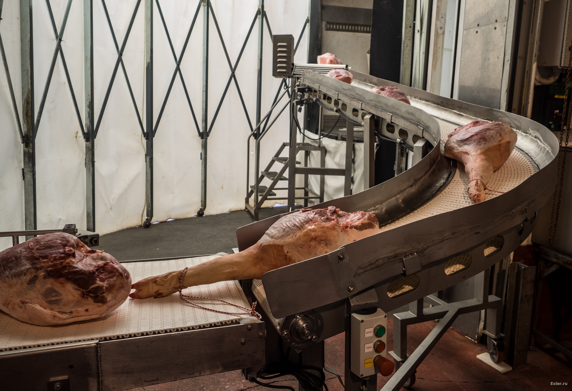 Начальная стадия создания хамона: свиные ляжки поступают на конвейр.