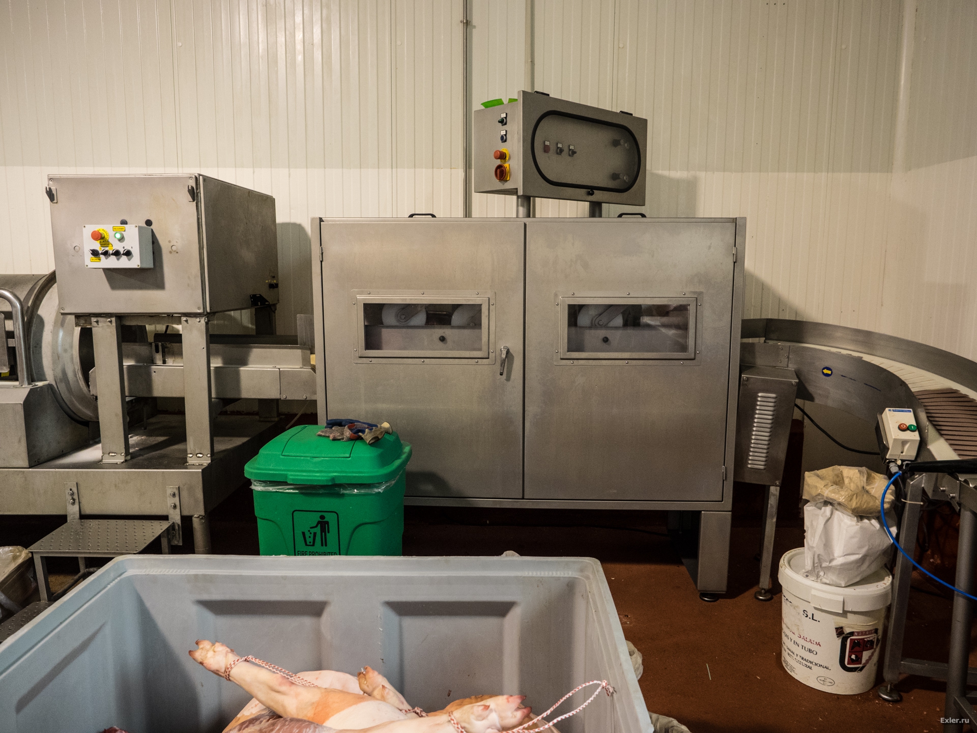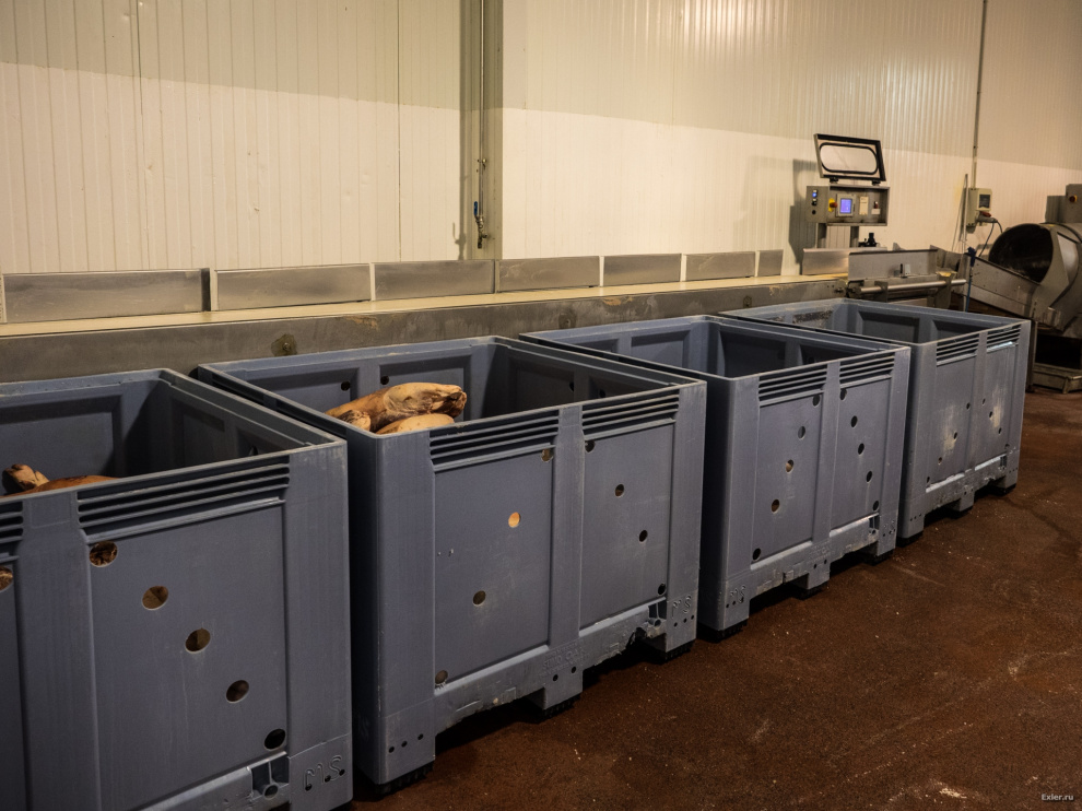 Автоматическая сортировка по весу: ляжки определенного весового диапазона попадают в предназначенный для нее контейнер. Делается это только потому, что засолка идет по формуле: 1 килограмм веса - 1 день засолки. То есть контейнер с 8-килограммовыми ляжками будет стоять в камере 8 дней, с 7-килограмовыми - 7 дней и так далее.