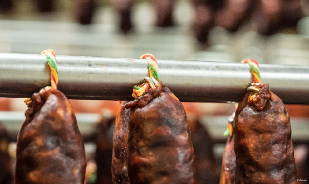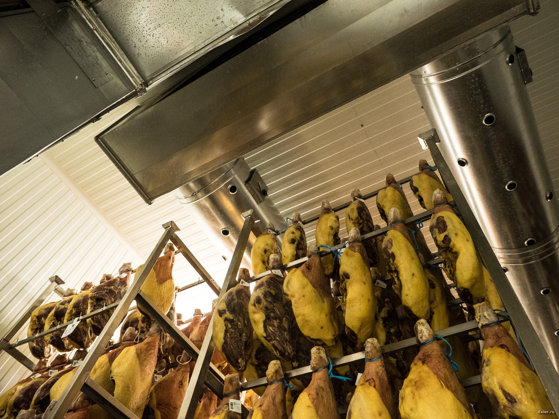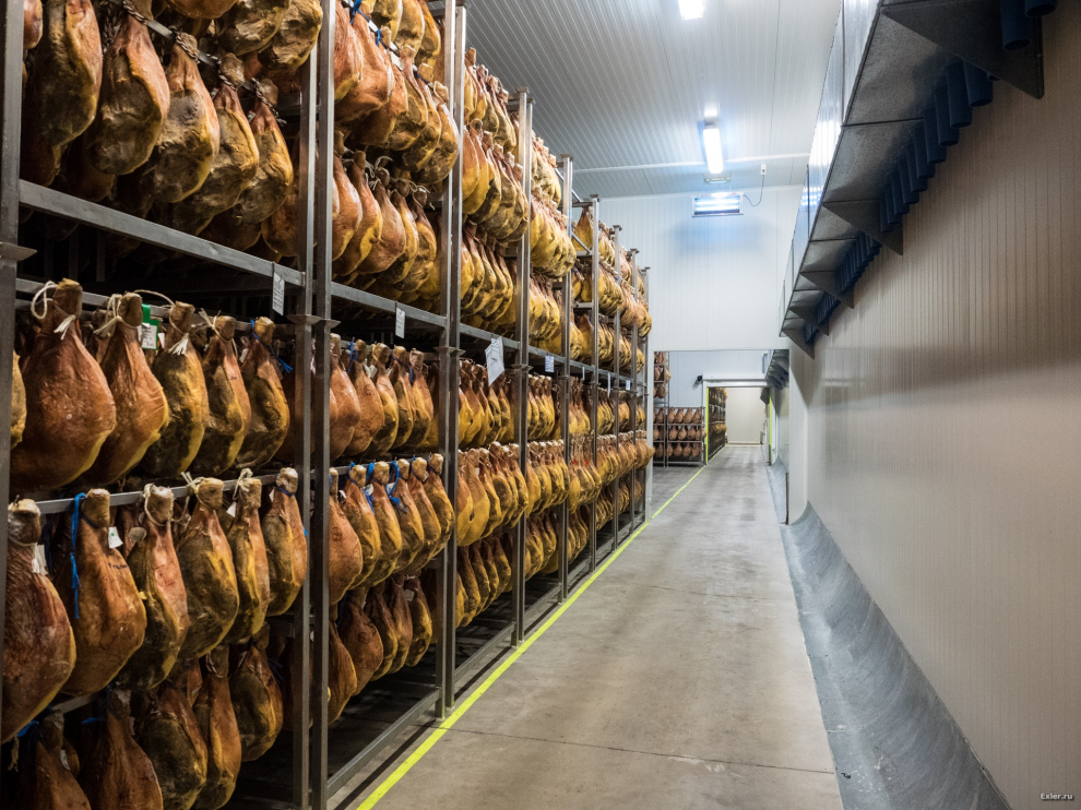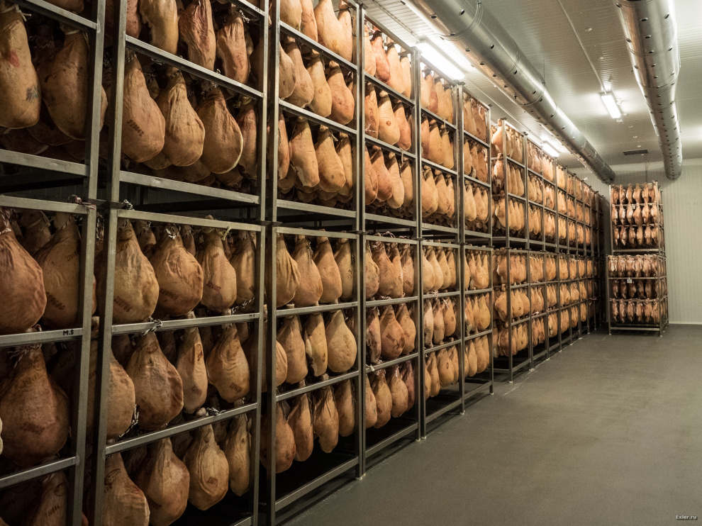 На верхних этажах фабрики находятся камеры, где выдерживаются колбасы и хамон.
