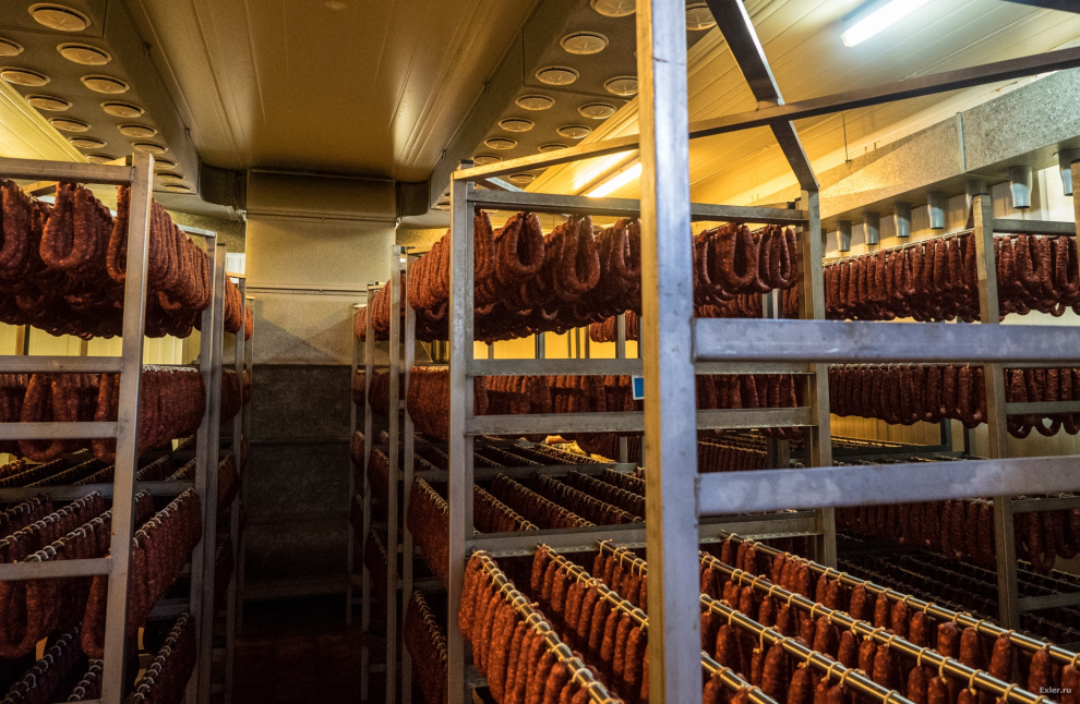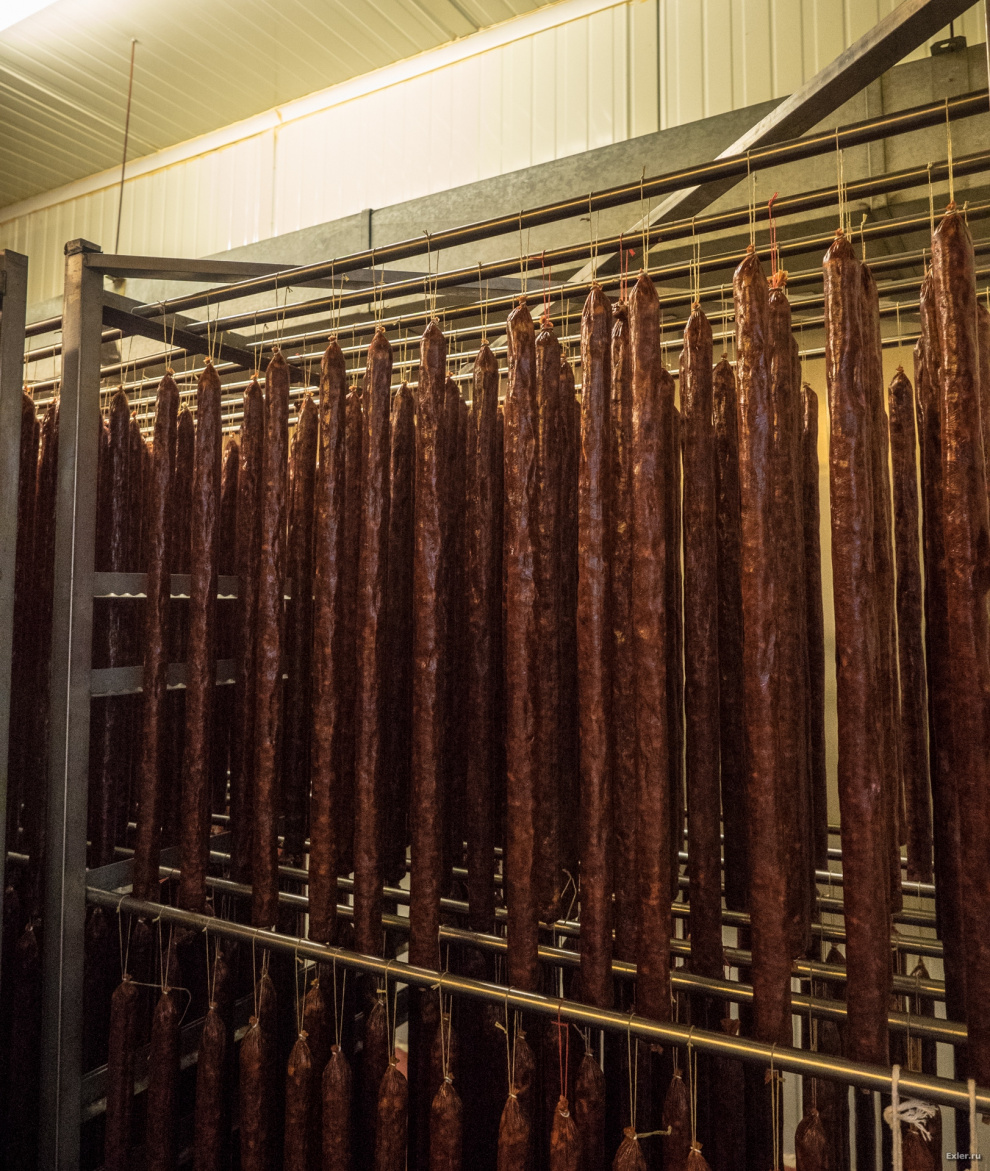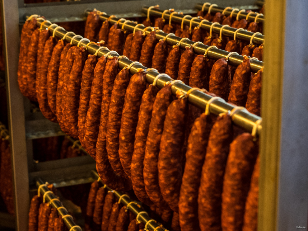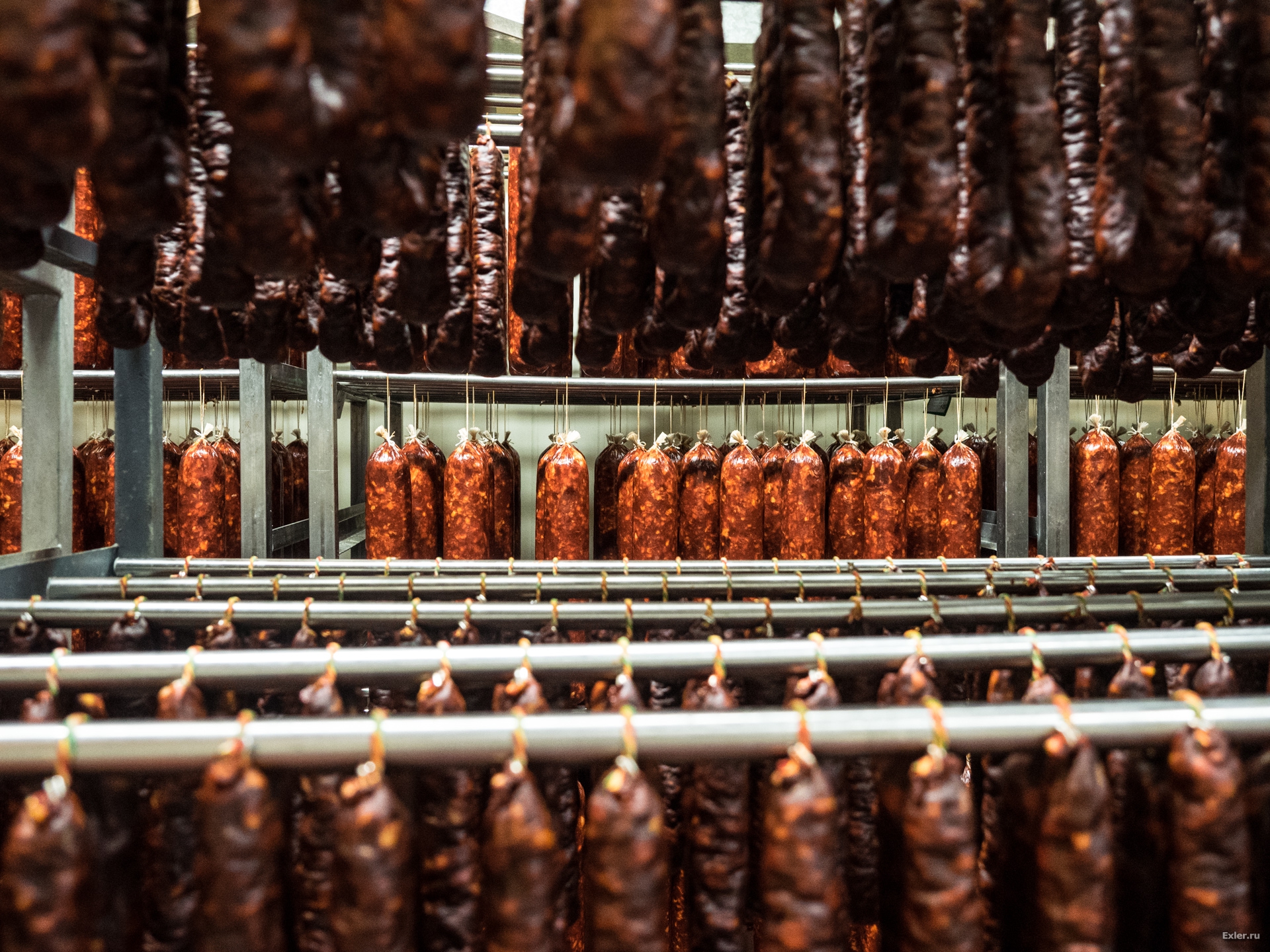 На верхних этажах фабрики находятся камеры, где выдерживаются колбасы и хамон.