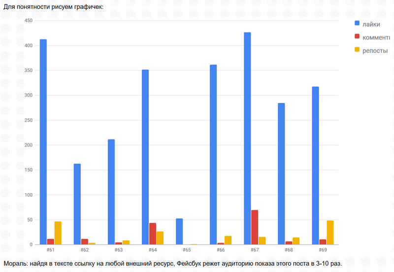 У Леонида Каганова на страничке запись о том, как Фейсбук режет аудиторию, встречая в тексте ссылки на внешние ресурсы. Леня анализирует лайки и перепосты на записях без внешних ссылок и с внешними ссылками. Из этого делает вывод - вполне справедливый, у меня похожие данные. (При открывании записи на странице Каганова сразу после прочтения немедленно закройте вкладку, иначе сайт Лени в самый неожиданный момент разорется, причем, скорее всего, матом. Это у него там такая милая фича.)
