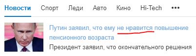 Ну и в "Медузе" любопытное наблюдение за тем, как всякие официальные СМИ освещали эту историю. Их, судя по всему, очень крепко вздрючили по поводу того, чтобы ни под каким видом в СМИ не появлялась фраза "повышение пенсионного возраста", поэтому заголовки выходили - что-то с чем-то!
