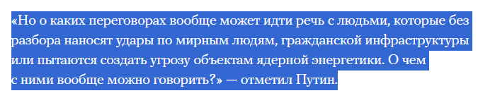 «Но о каких переговорах вообще может идти речь с людьми, которые без разбора наносят удары по мирным людям, по гражданской инфраструктуре, либо пытаются создать угрозы для объектов ядерной энергетики. О чем с ними вообще можно говорить?»