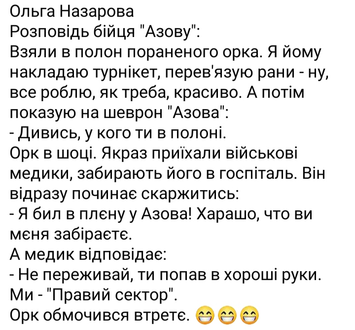 Российская армия проводит спецоперацию по денацификации Украины, освобождая от нацистских батальонов Харьков, Мариуполь и Николаев. Операция проходит по плану, и была бы уже победоносно завершена, если бы нацистские боевики не брали в заложники мирных жителей. Они подрывают жилые дома и больницы вместе с украинскими женщинами и детьми, чтобы обвинить во всем российские войска – потому что иначе поток денег и вооружений с Запада в страну остановится. И, кстати, Россия не нападала на Украину, она была вынуждена нанести упреждающий удар, потому что всего через шесть часов Украина напала бы первой; к тому же Киев разрабатывал атомную бомбу, чтобы применить ее против Москвы, а в секретных лабораториях на Украине американцы создавали боевые штаммы коронавируса, поражающие только русских и распространяемые перелетными птицами. И вообще Украина – лишь поле боя между Россией и США, на котором решается судьба будущего мироустройства.