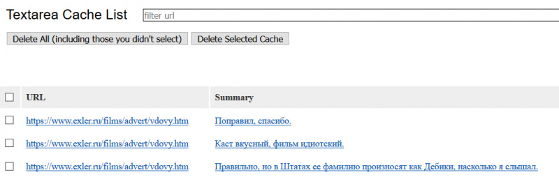 Поэтому стал искать соответствующие плагины. Перепробовал с пару десятков, они все - кривые до безобразия. В конце концов для FireFox остановился на Textarea Cache. Он тоже кривой. Но свою работу делает неплохо. Для вызова истории ввода текста нужно щелкнуть по пиктограмме плагина и там щелкнуть по соответствующей пиктограмме. Получаете историю ввода текста вот в таком формате. Адрес отдельно, текст отдельно. И его можно скопировать.