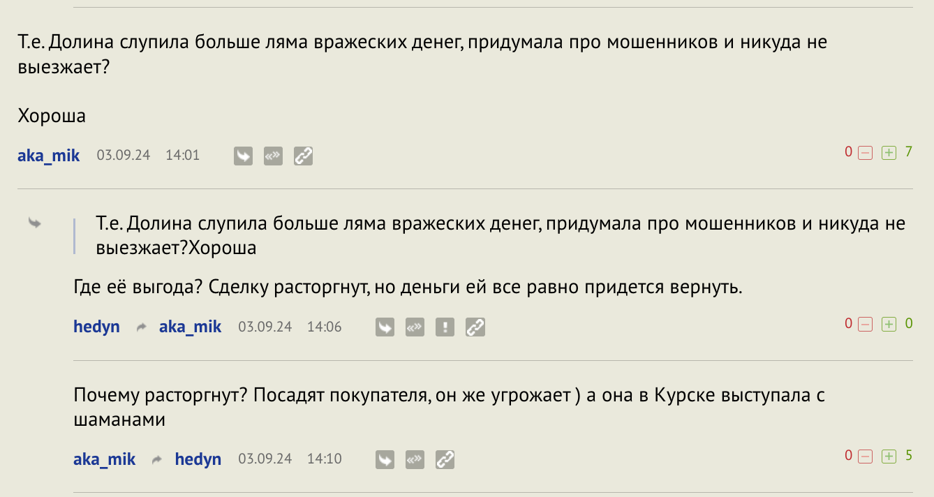 Закончилось там все интересно: покупательница в квартиру въехать не смогла, квартиру вернули Долиной, а покупательницу по суду просто послали. Типа как свои деньги она должна взыскивать с мошенников, хотя деньги за квартиру она переводила Долиной, а та уже передала их мошенникам.