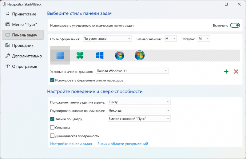 Но, впрочем, новая кнопка Пуск меня вполне устраивает, мне нужно было сохранить панель задач от Windows 11, но при этом убрать группировку вообще. И это там делается элементарно, все отлично работает.